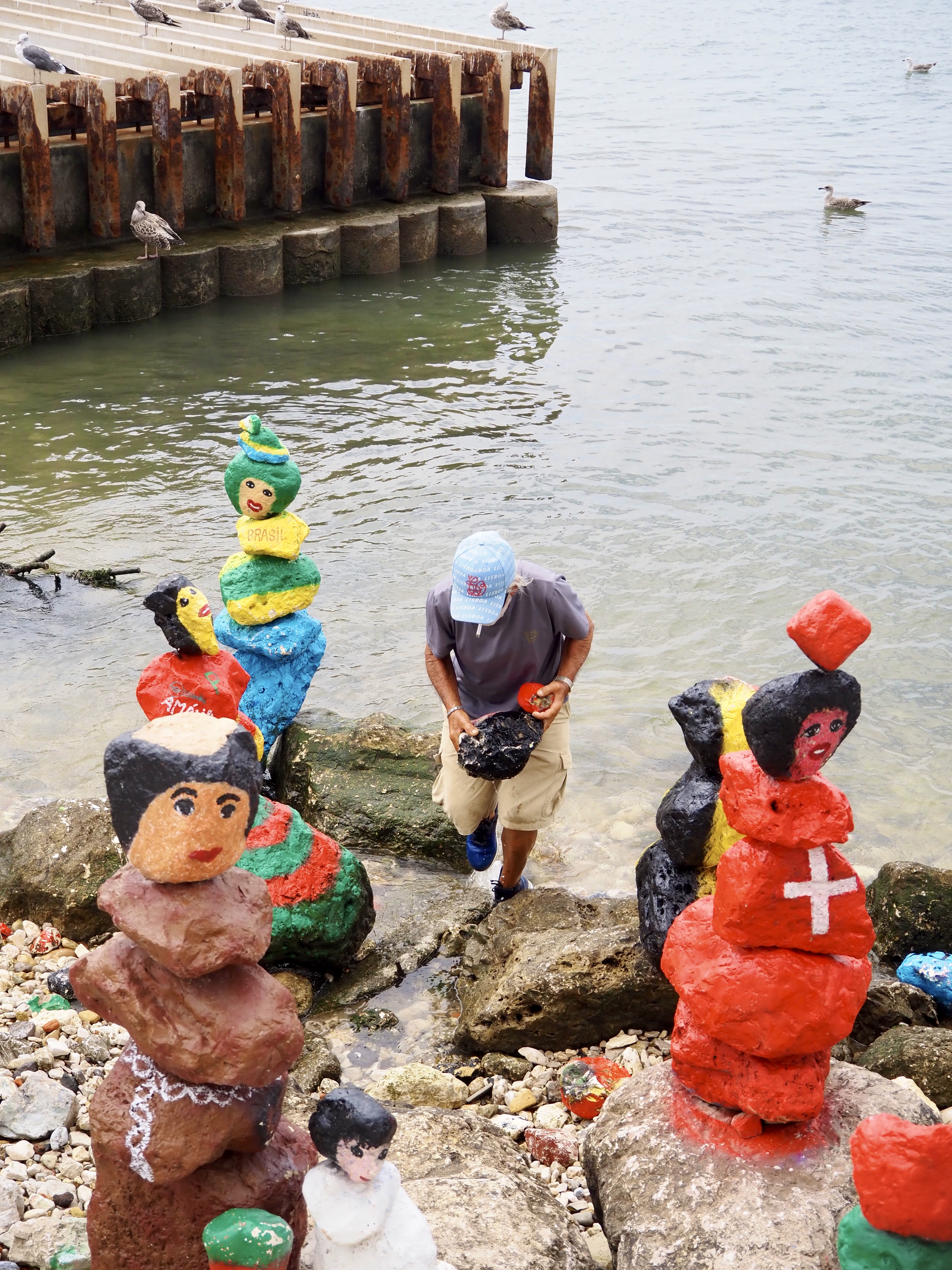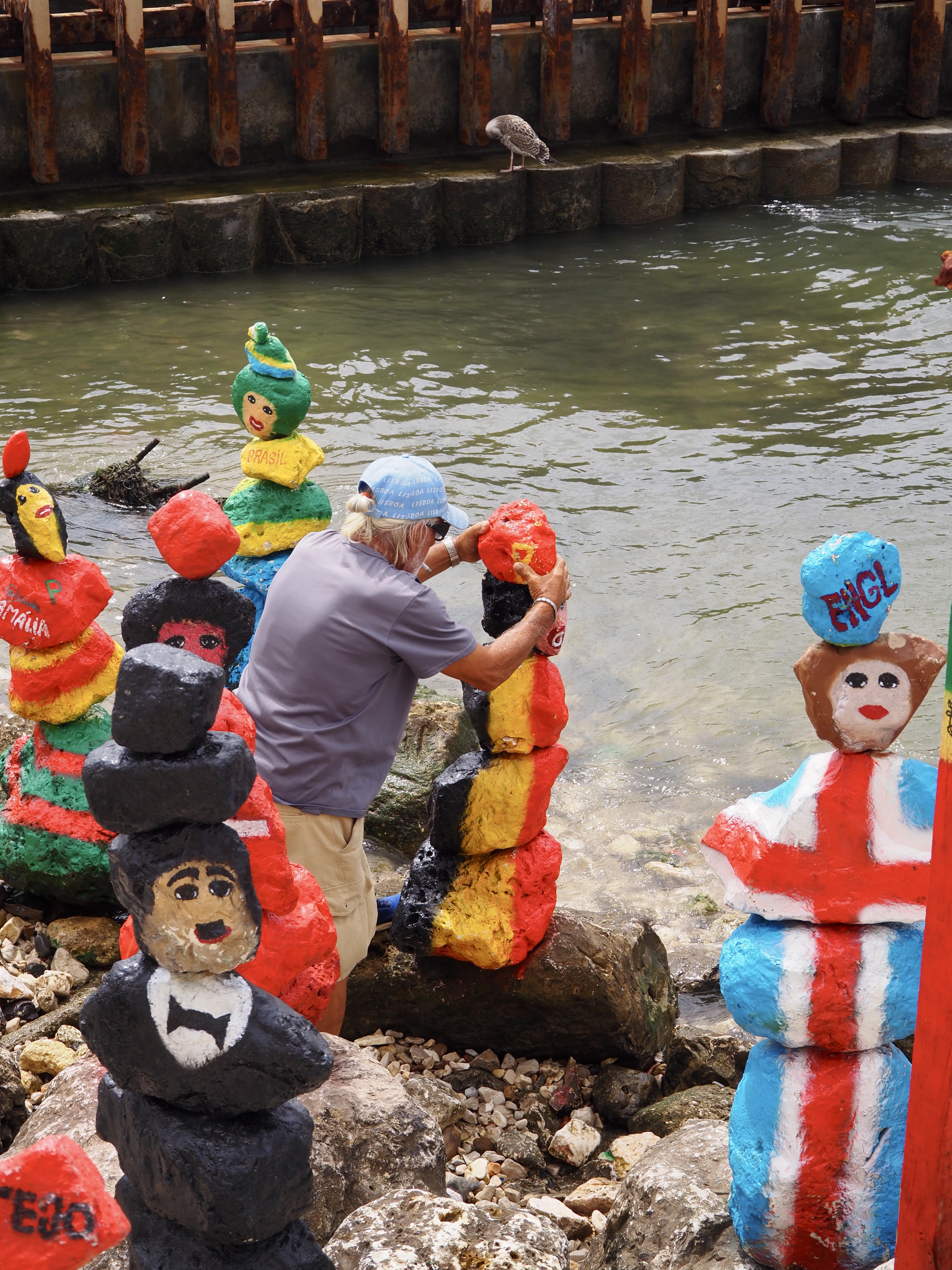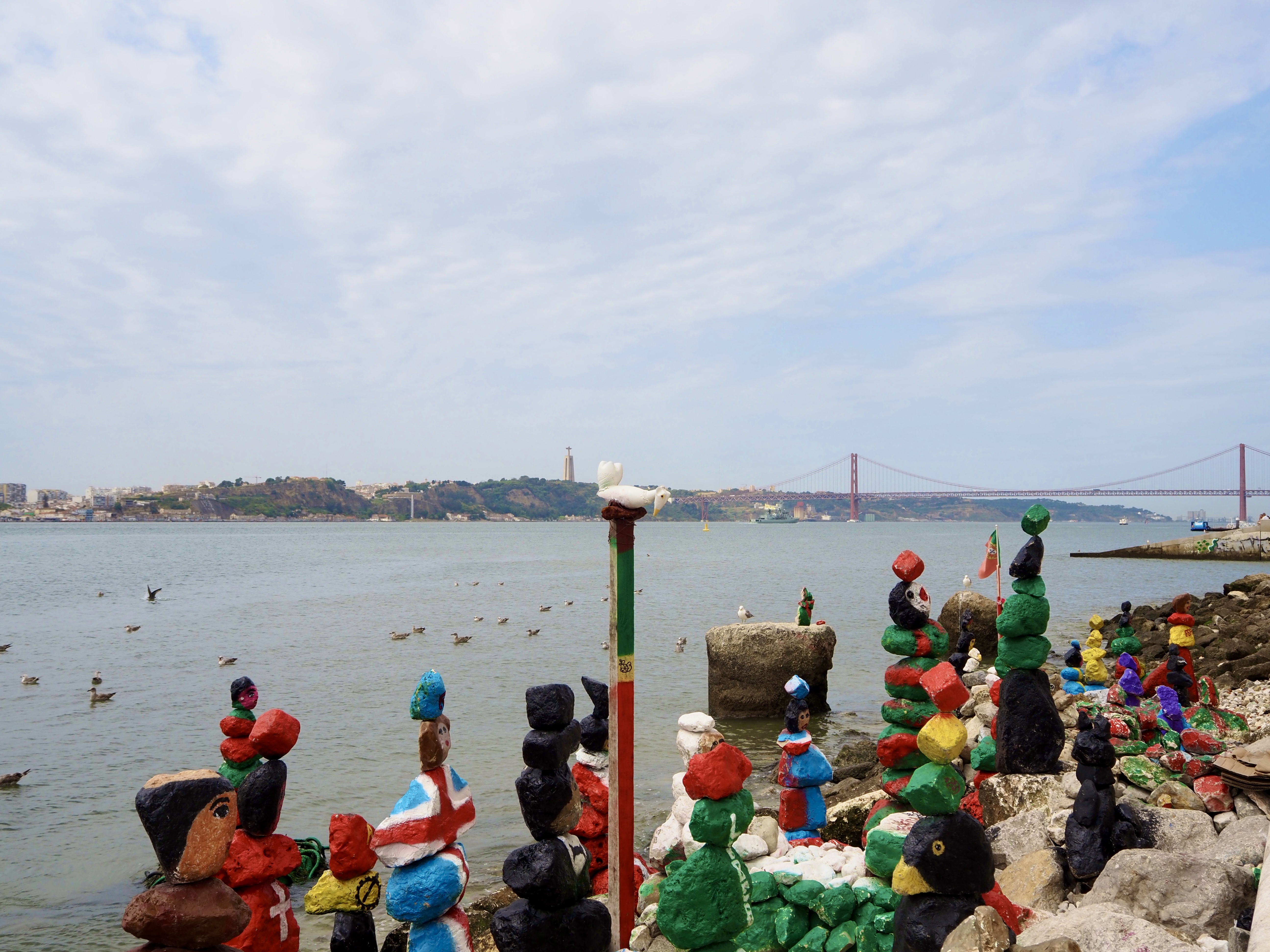 Photos mettant en avant les créations d’un homme à la retraite sur la Ribeira des Naus, le long du Tage. Chaque jour, on retrouve cet homme au même endroit, veillant sur ses statues colorées et s’appliquant à faire tenir debout ses œuvres, dont les pierres peintes à la main regagnent régulièrement le fleuve.